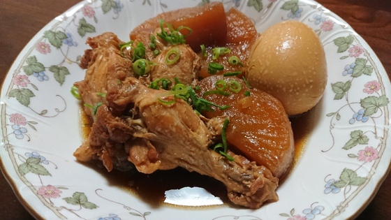 鶏肉と大根を胡麻油と刻んだ生姜でで焼きつけたら、そのまま醤油・酒・味醂・砂糖とともに圧力鍋で7分!